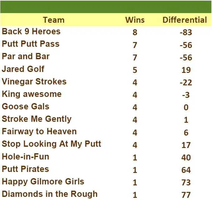 9 weeks of play every Wednesday (18 holes a night) + final playoffs